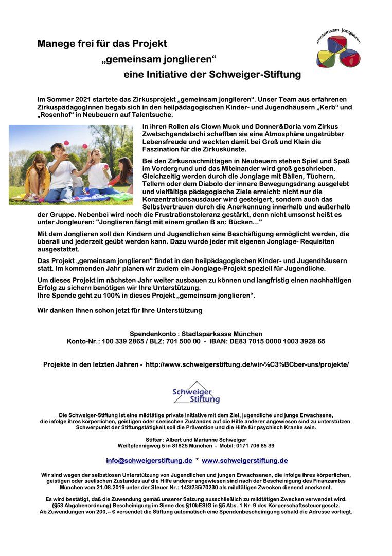 Die Schweiger-Stiftung ist eine mildtätige private Initiative mit dem Ziel, Jugendliche und junge Erwachsene, die infolge ihrer körperlichen, geistigen oder seelischen Verfassung auf die Hilfe anderer angewiesen sind, zu unterstützen.
